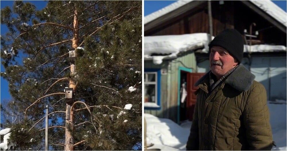 Мужчина продолжил дело отца, который когда-то посадил на участке сосны, - теперь он сам мастерит и развешивает скворечники. Всего на деревьях и в огороде у него 14 птичьих домиков.