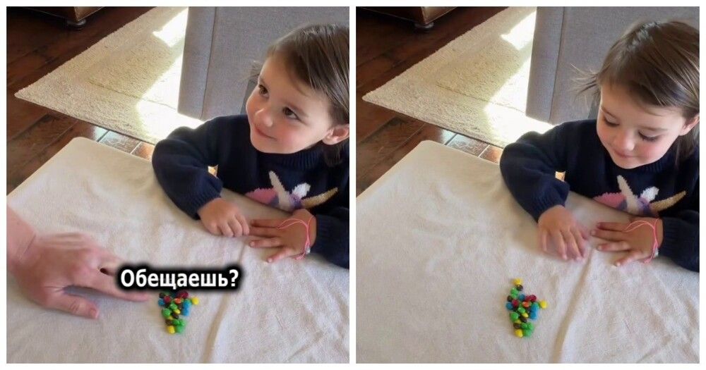 Женщина решила узнать, сдержит ли обещание её дочка. Она сказала девочке, что уходит в ванную и попросила не есть оставленные возле неё конфеты. Дочка согласилась.