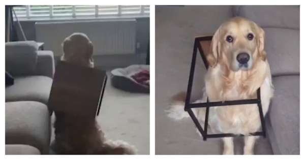 Ретривер застрял в кофейном столике, но не хотел отвлекать хозяина от важного рабочего звонка. Четвероногий друг человека не стал лаять, чтобы привлечь внимание.