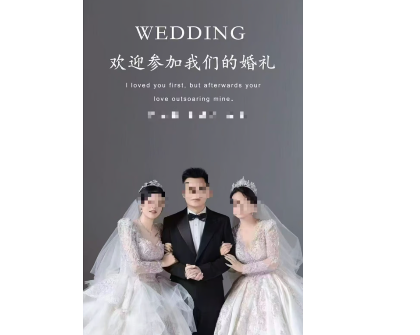 И пока обычный китаец не может позволить себе ни одной жены, некоторые берут сразу две, даже когда это запрещено законом?! В китайской соцсети было опубликовано приглашение на свадьбу, к которому прилагалась фотография мужчины в строгом черном костюме в окружении двух женщин в белых свадебных платьях. Согласно приглашению, в котором были указаны имена жениха и его двух невест (!!!), свадьба должна была состояться в Century Jiayuan Banquet Centre, элитном ресторане города во второй половине дня 19 апреля."Этому парню, должно быть, завидуют многие мужчины. Как ему повезло!" - пошутил один местный пользователь социальных сетей.