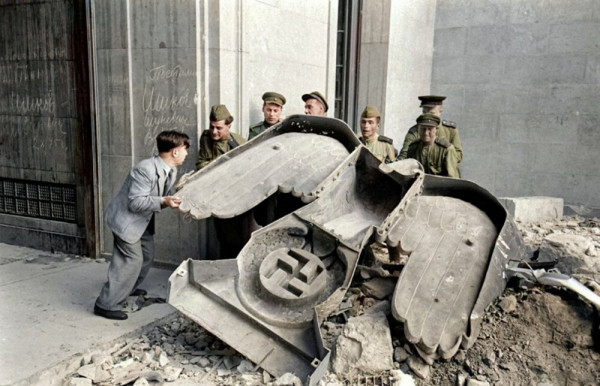 Советские солдаты забирают бронзового нацистского орла с фронтона Рейхсканцелярии. Им помогает немецкий студент (крайний слева). Берлин,1945 год.2 мая 1945 года Берлин пал - это стало ключевым событием, предопределившим окончание войны. Вскоре был подписан Акт о безоговорочной капитуляции Германии. От Советского Союза документ подписал маршал Георгий Жуков, а от союзников - главный маршал авиации Артур Теддер. Текст акта был составлен на русском, английском и немецком языках, а уже 9 мая его доставили в Москву.