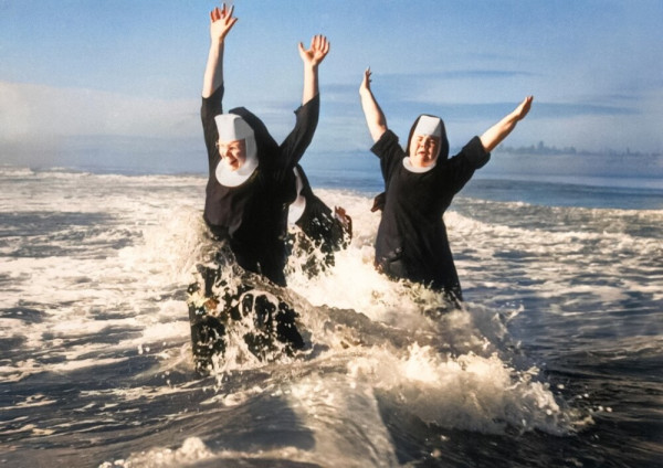 Каникулы монашек, 1960 год.Три монахини играют в океанском прибое около Грейленда. Они были частью группы из семи монахинь, которые смогли провести неделю на берегу моря в рамках новой программы каникул.