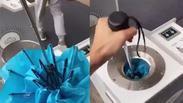 Корейцы создали устройство, которое выглядит как гибрид уличной урны и реактора.Пользователю нужно вставить мокрый зонт в отверстие, а потом случится магия. За считанные секунды ткань становится сухой, а человек - чуть более счастливым. Без тряски, промокших полов и танцев с пакетами.