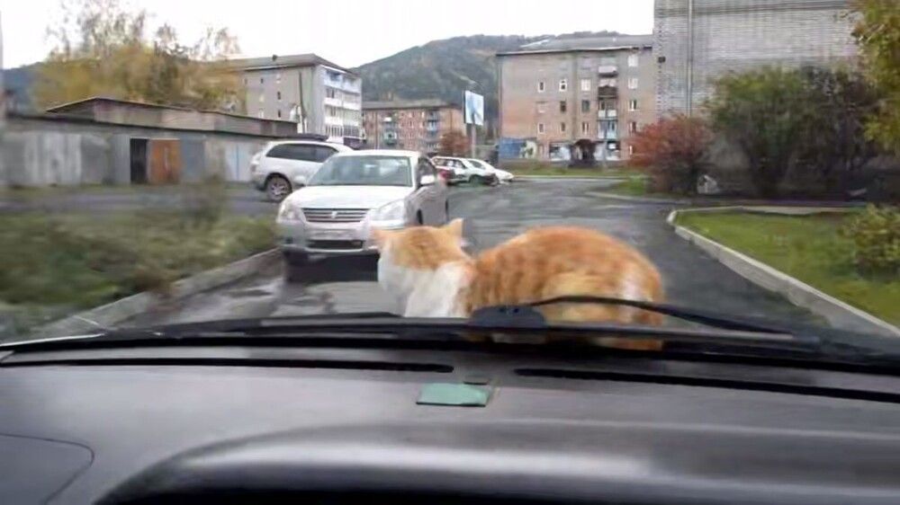 Автомобилист увидел кота на капоте своего транспортного средства. Автор решил, что как только машина тронется, животное сразу же покинет капот. Но не тут-то было!