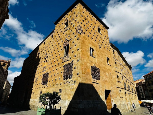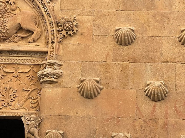 Строительство началось в 1493 году, но Мальдонадо так и не увидел свой дом завершённым. Дело продолжил его сын, Родриго Ариас Мальдонадо, и к 1517 году здание обрело свой нынешний облик.Фасад - причудливая смесь готики, ренессанса и мудехара - насчитывает более 300 резных раковин. Они не только напоминают об ордене Сантьяго, но и символизируют путь паломников к могиле апостола Иакова. Здесь же находятся гербы католических монархов, четыре готических окна, каждое со своим уникальным узором, и портал с фамильным гербом Мальдонадо. Над входом - дельфины, знак любви в эпоху Возрождения, и затейливые растительные орнаменты.