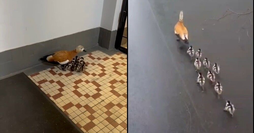 Мама-утка привела свой крохотный десант прямо в подъезд одного из домов. Заблудившееся семейство пришлось отправить обратно в водоем.