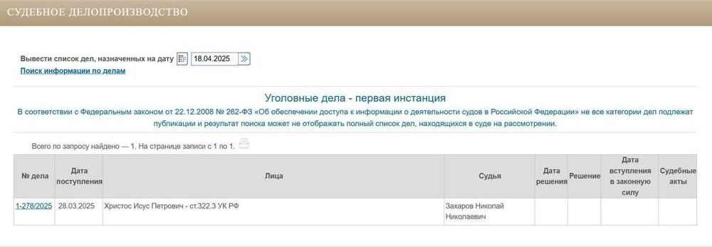 В итоге по статье 322.2 УК РФ в Московском районном суде Исусу выписали штраф в 60 тысяч рублей. Помимо этого, на него составили протокол по ст. 17.8 КоАП РФ ("Воспрепятствование законной деятельности должностного лица").Как отмечают СМИ, Исус Христос имеет богатую криминальную биографию. В 1994 году его судили за грабёж, в 1996-ом - за кражу, освободившись в 2007-ом и не пробыв на свободе и года, он отправился вновь за решётку за кражу с проникновением в жилище. С 2014 года он состоял на учёте у нарколога. Но уже в следующем году судебно-психиатрическая экспертиза обнаружила у Исуса органическое расстройство личности, после чего с учёта его сняли. К сожалению, история его имени неизвестна. Но учитывая, что у него не совсем всё в порядке с ментальным здоровьем, то можно предположить, что он самостоятельно себя переименовал, причём с ошибкой.