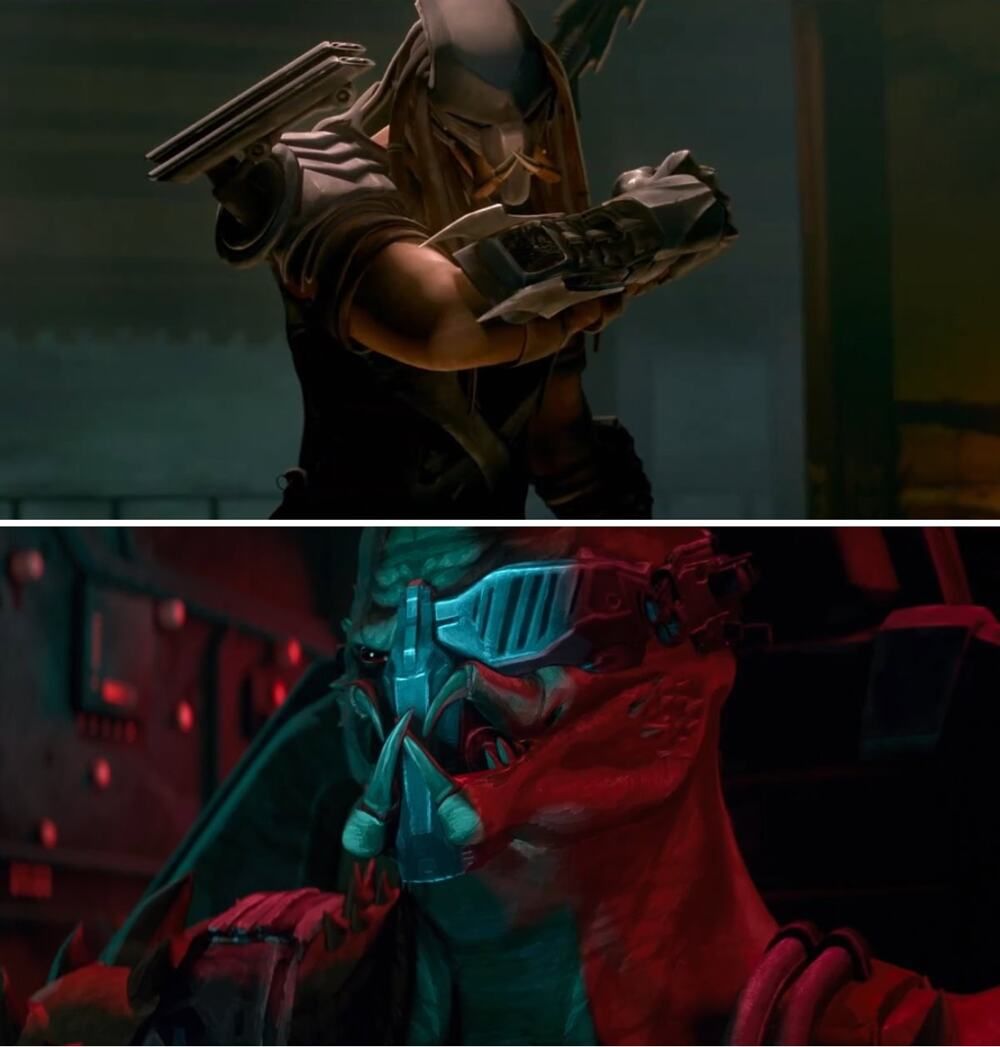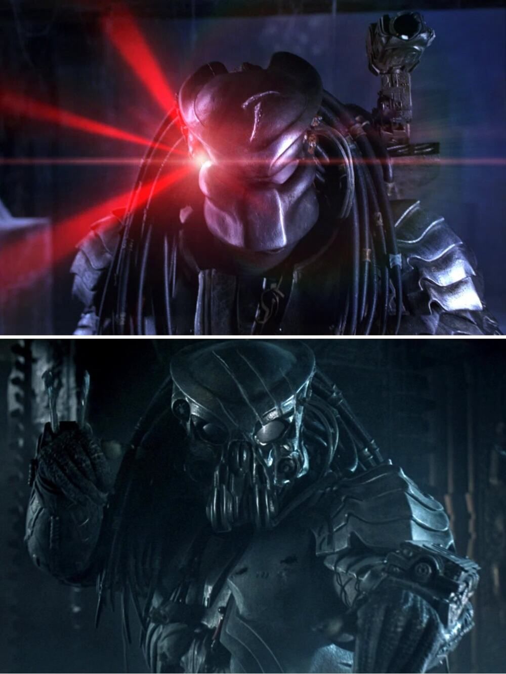Самым заметным персонажем стал так называемый Предалиен - гибрид Хищника и Чужого. Стандартный Хищник здесь выглядит мрачнее и грубее - как с точки зрения характера, так и с точки зрения дизайна. А ещё из-за особенностей этого фильма, который был снят безумно тёмным, разглядеть детали мы практически не можем. Жаль, ведь тут был показан Волк - один из самых крутых и опытных Хищников, который прилетел на Землю не ради охоты, а чтобы порешать делишки.