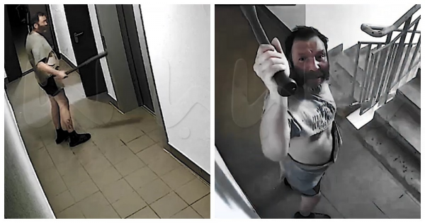 Он орудует битой, долбит по дверям и ломает подъездные камеры.