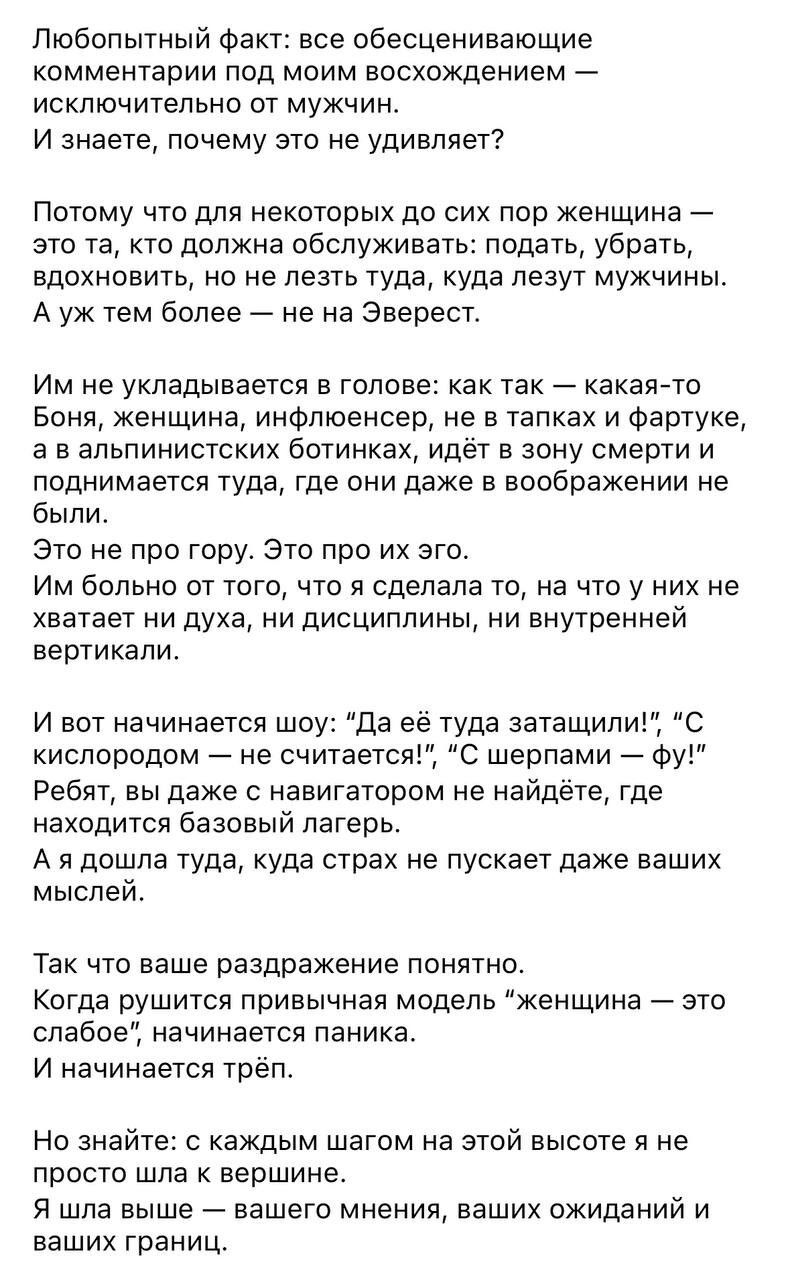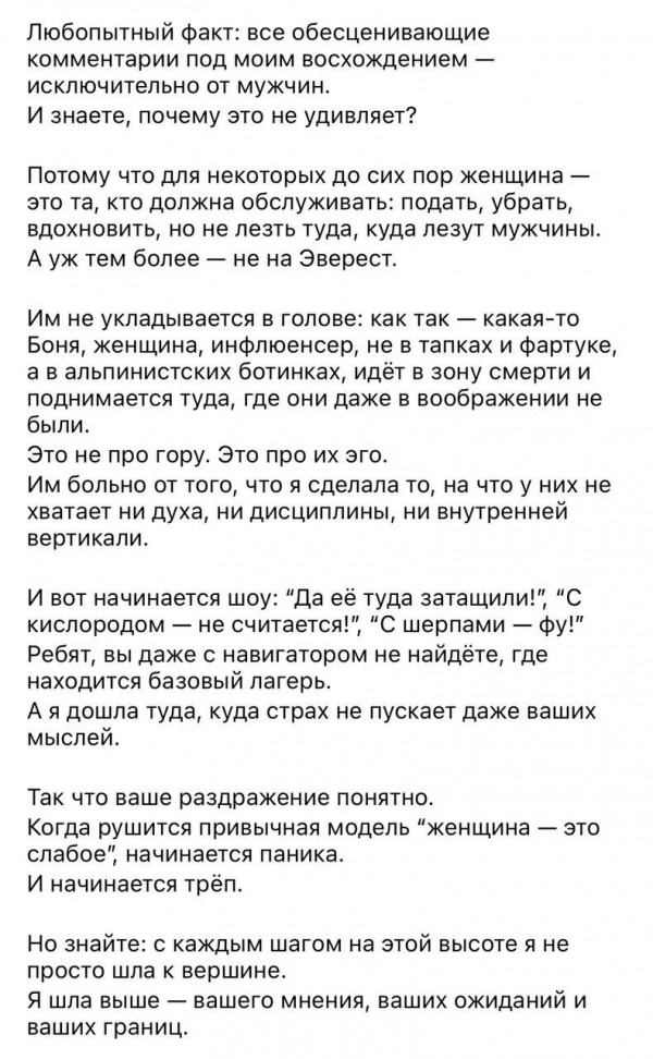 Виктория Боня продолжает издеваться над собой тестировать возможности своего организма. От ретритов по Южной Америке с употреблением галлюциногенов телеведущая перешла к покорению горных вершин. 19 мая она взошла на Эверест, о чём гордо возвестила в своих соцсетях.Боня на протяжении всего пути к вершине публиковала в соцсетях увлекательные видео, снимая и днём, и ночью.Ей своими глазами довелось увидеть тех, кто навсегда остался у вершины, пережить непогоду, кислородное голодание и прочие лишения.И вот, наконец, она на вершине Эвереста. Однако вот незадача - российские СМИ весьма прохладно оценили это достижение. Большинство изданий его просто не заметило. Также как спортивные альпинистские клубы, которые не поздравили Викторию с восхождением. Более того, в постах, где она публиковала фото с Эвереста, комментаторы-мужчины подшучивали и подсмеивались над телеведущей.Это типичная ситуация обесценивания, считает Виктория, очень распространена в российском обществе. У хейтеров не укладывается в голове: какая-то Боня, женщина и инфлюэнсер, не стоит на кухне с тряпкой в руках, а лезет в горы. Многие мужчины даже в воображении туда не поднимались, уверена Боня, а она смогла в реальности взойти на высочайшую вершину мира.