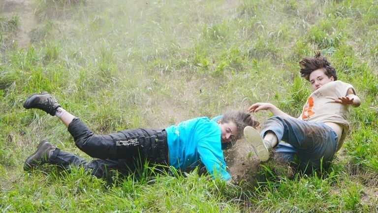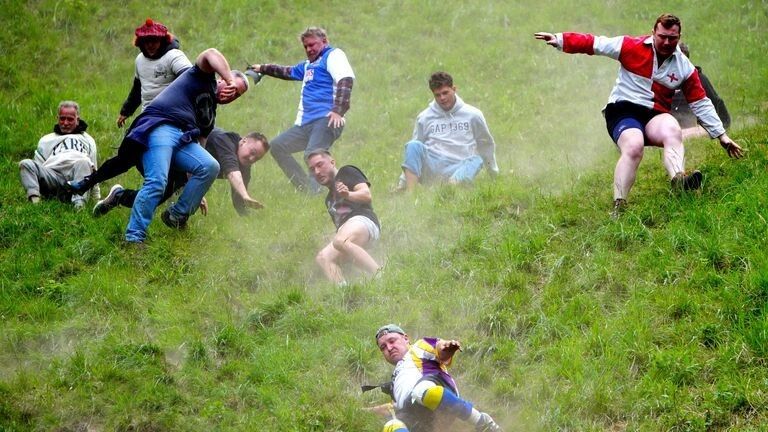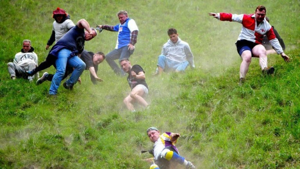 Смельчаки, которые любят молочные продукты, съехались из разных уголков мира в Глостершир в Англии, чтобы посоревноваться в безумных гонках со стремительного, почти вертикального, холма. Участники бежали, падали, набивая себе синяки, чтобы получить заветный выигрыш - 8-фунтовую груду сыра.
