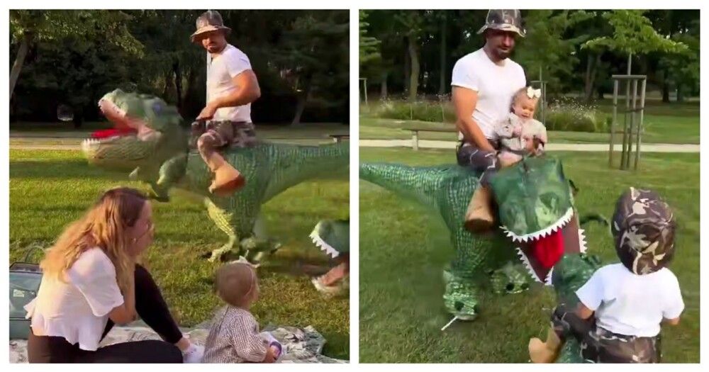 Мужчина и его сын облачились в надувные костюмы наездников динозавров, а затем устроили небольшую прогулку.