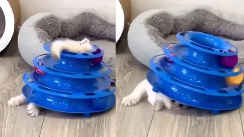 Маленький пушистик получил игровую пирамидку от любимых хозяев, но вместо того чтобы гонять шарики по спиралям, он решил, что игрушка - это его личный космический скафандр.Он нырнул внутрь игрушки, пытаясь втиснуться в нее целиком. Котенок крутился, пыхтел и искренне не понимал, что он делает не так.