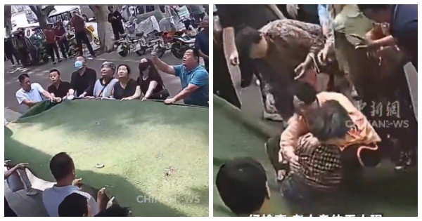 102-летняя женщина из провинции Хэнань в Китае случайно вылезла из окна третьего этажа, и пока она цеплялась за выступ, владелец ближайшего магазина бросился ей на помощь и вместе с прохожими расстелил ковер, который "поймал" падающую женщину.
