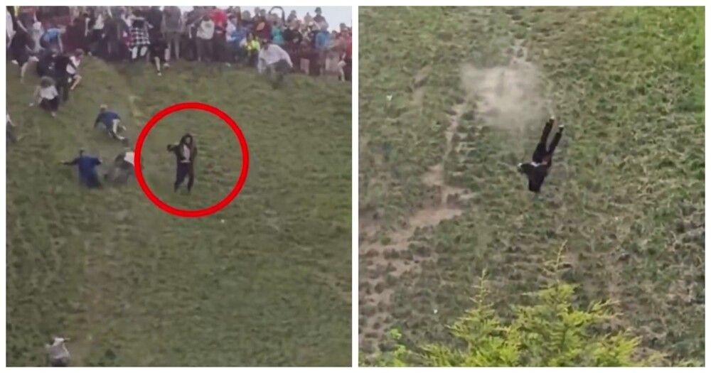 В Англии недавно прошёл традиционный забег с горы за головкой сыра. Пользователи сети выделили одного из участников, который улетел кубарем с холма.