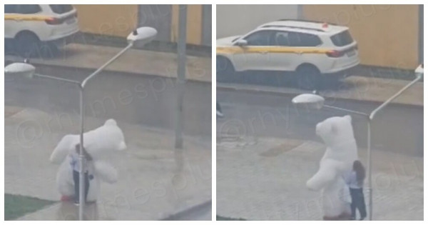 Костюм медведя буквально заливало водой. Но герой не сдался. Собрав всю свою силу и волю, он продолжил борьбу с дождем, хотя без помощи прохожих не обошлось.