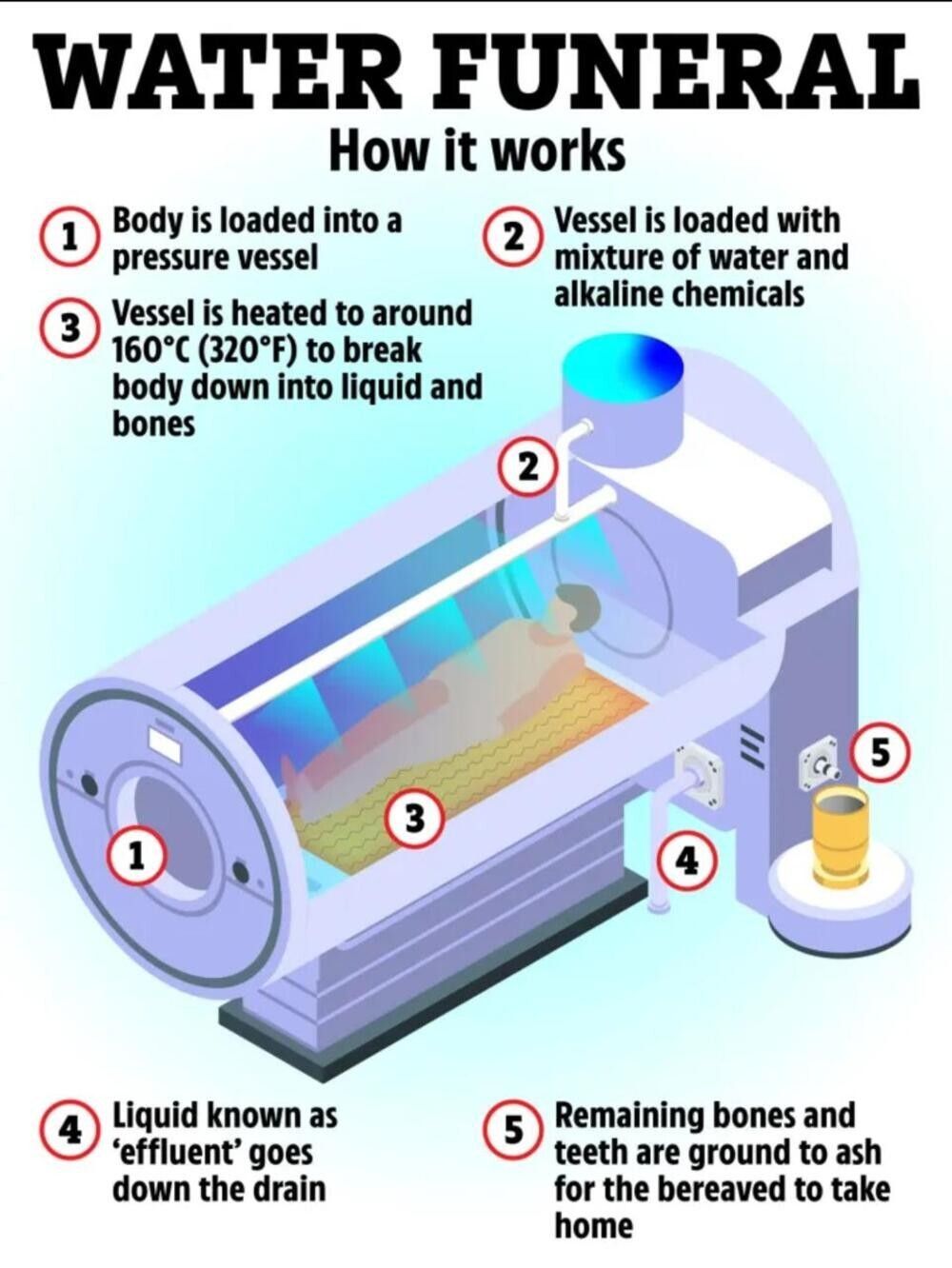 Альтернативный и противоречивый способ похорон в скором времени может появиться в Британии. Так называемая водная кремация, ресомация, щелочной гидролиз или "варка в мешке" предполагает растворение тела с последующим смывом жидкости в канализацию. Сторонники щелочного гидролиза настаивают на том, что их метод менее губителей для природы, нежели погребение или кремация, поскольку не выделяется вредных жидкостей и токсичных газов. Они считают, что водная кремация должна прийти на смену традиционным похоронам. Однако одобрения "варка" тела от правовой комиссии пока не получила.Как пишут СМИ, технология водной кремации была запатентована ещё в 1888 году, однако массового распространения так и не получила. Тело усопшего помещают в специальный сосуд под давлением, в котором находится нагретая вода и щелочные химикаты, затем жидкость вновь нагревают до 160 градусов по Цельсию. Спустя примерно 4 часа можно смывать остаётся жидкость коричневого цвета, которую называют "стоками". Напоминающая чай или эль жижа не содержит тканей тела или ДНК, поэтому её можно безбоязненно смывать в канализацию, считают сторонники водной кремации. Оставшиеся кости при этом можно измельчить в прах и отдать родственникам усопшего, чтобы они могли его развеять или сохранить в вазе, как это делают с пеплом после кремации. То же касается различных тазобедренных и прочих имплантов - они остаются в ёмкости нетронутыми.