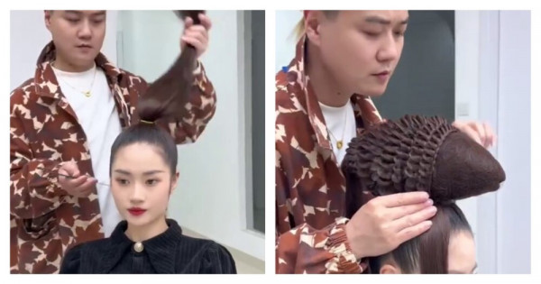 Парикмахер делает оригинальные прически на голове девушки, используя разные техники укладки волос.