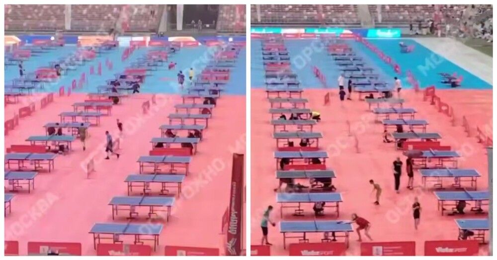 После дождя площадка фестиваля по настольному теннису в Лужниках стала напоминать каток. Многие участники ничуть не огорчились.