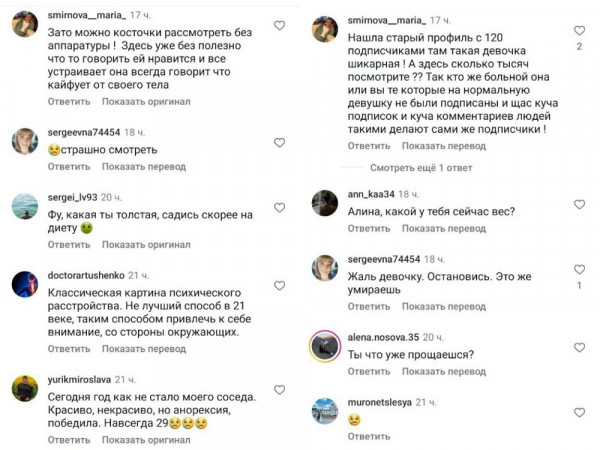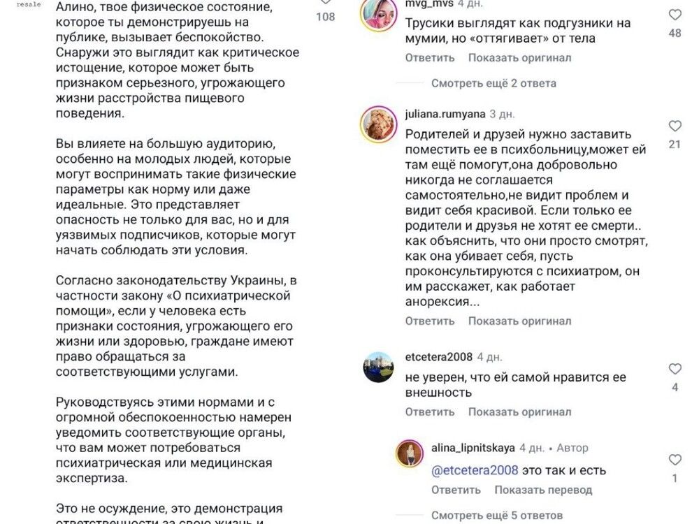 Конечно, девушка подаёт свой контент с юмором, но родители подростков обеспокоены: не каждая школьница прочтёт между строк, многие, напротив, воспримут вопрос "а ты похудела к лету?" как мотивацию к действию.Не все подростки понимают, что девушка больна, и, возможно, неизлечимо."Я, как мама, не хотела бы таких вот "кумиров" для своего ребенка". - написала украинка под одним из видео Липницкой, и, похоже, высказала общее мнение многих родителей.