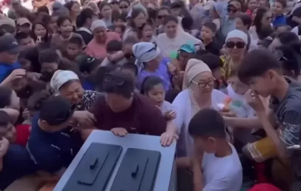 В городе Актау местный предприниматель решил порадовать малышей и устроил раздачу бесплатного мороженого и сахарной ваты. Однако на место пришло слишком много людей, и началась сильная давка.