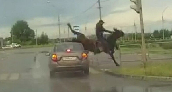 Мужчина пересекал дорогу верхом на лошади, когда водитель легковушки на полном ходу врезался в животное.