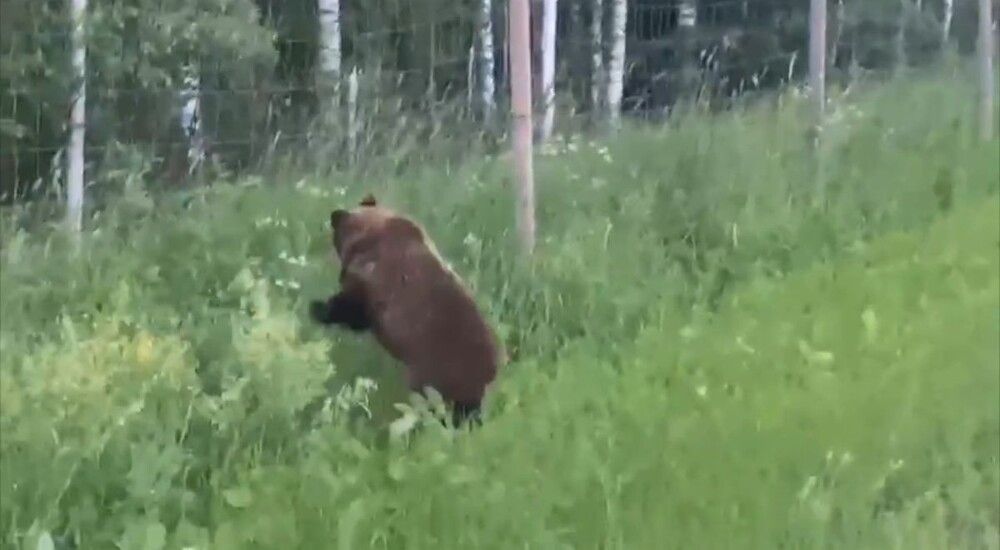 На трассе в Лодейнопольском районе Ленинградской области медведь выбежал из леса в поисках еды. Косолапый не смог вернуться из-за забора, ограничивающего выход диких животных на проезжую часть. К счастью, мимо проезжали инспекторы ДПС.