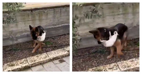 Белый кот забрался на пса и повис на нём. Комичная сцена попала на видео.