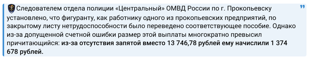История началась в 2021 году в городе Прокопьевск, когда 40-летний работник предприятия вышел на работу после больничного. Всё шло спокойно, пока ему не капнула денежка за больничный. Дело в том, что девушка из отдела кадров допустила небольшую ошибку: поставила цифру не туда и сделала несчастного героя обладателем совершенно неожиданного бонуса - вместо привычного пособия в размере 13 746,78 рублей на счёт упало 1 374 678 рублей. Ох уж эта сила запятых.