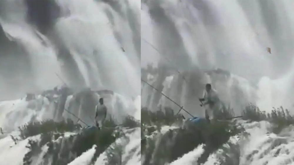 Туристы запечатлели мужчину, который ловил рыбу в водопаде на границе Китая и Вьетнама.