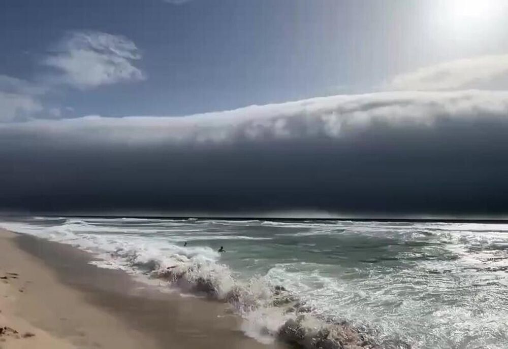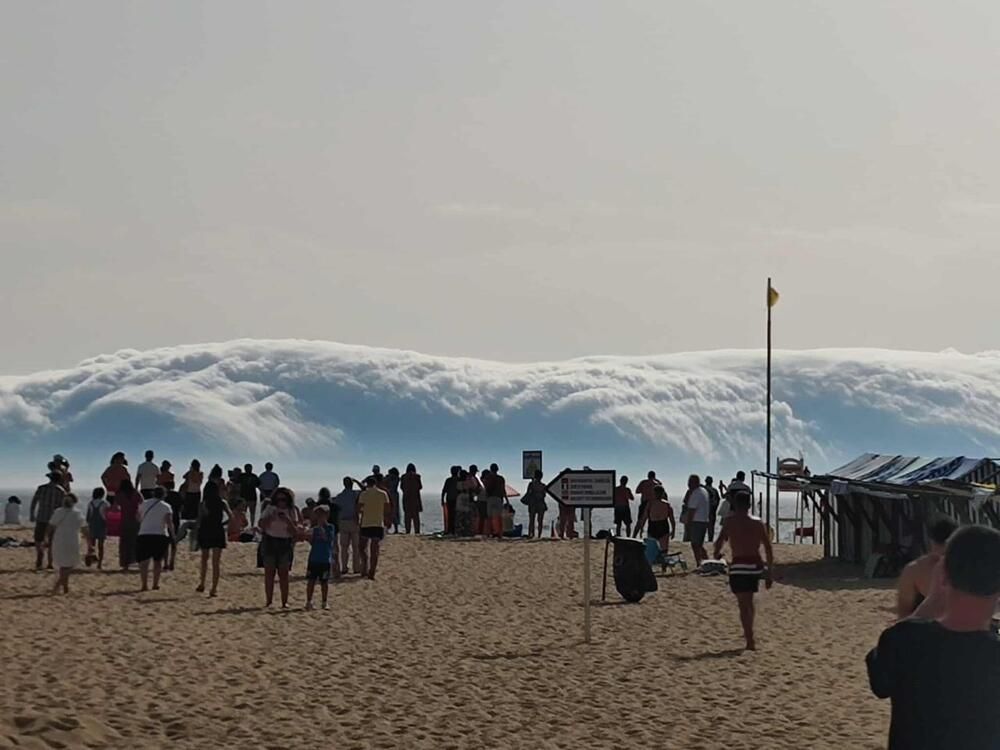 Люди, отдыхающие на пляже в Португалии, стали свидетелями редкого пригородного явления под названием "рулонное облако". Огромное облако, напоминающее гигантскую волну, пришло с океана.