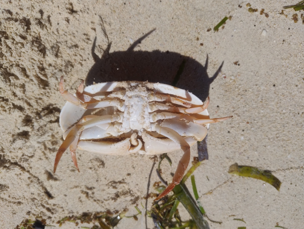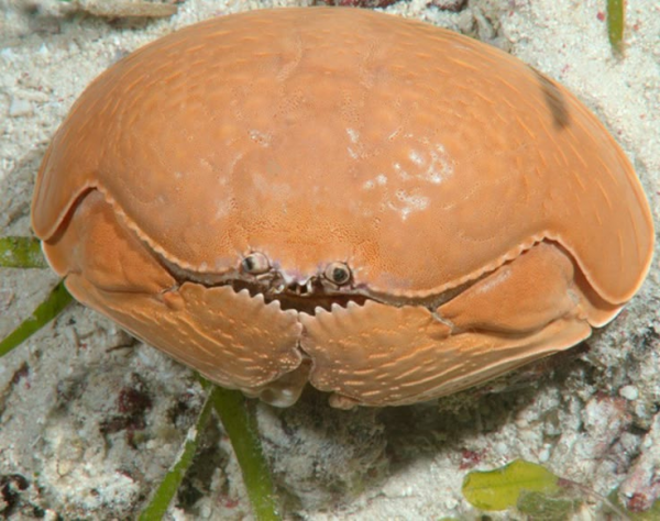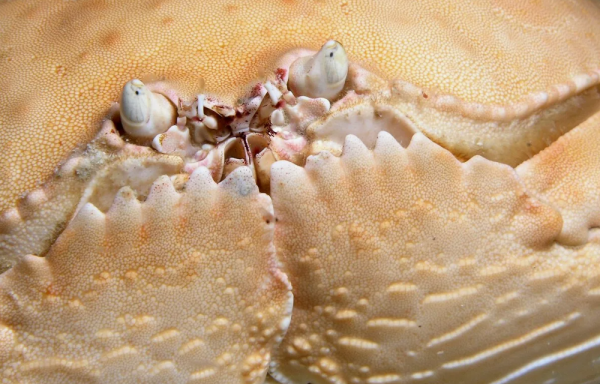 Вы только посмотрите на его доспехи, они превосходны даже по меркам других крабов! Толстый и прочный панцирь с боков загибается книзу и защищает ноги, которые сами по себе бронированы на отлично, кстати. Благодаря такому строению карапакса, краб может принимать превосходную оборонительную позу.