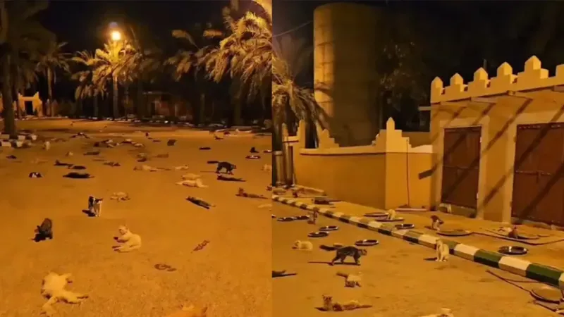Ночная улица в одном из районов Саудовской Аравии напоминает сюрреалистичную открытку - теплый желтый свет фонарей заливает асфальт, пальмы застыли в темноте, а дорога... усыпана котами. Главное - никому случайно не наступить на хвост. Десятки, сотни - рыжие, полосатые, черные, белые. Все они будто выпали с неба и теперь лениво греются на теплом покрытии.Они умываются, дремлют и смотрят на прохожих, совершенно игнорируя условности городского движения. Кошки в этом районе полноправные хозяева. Машины осторожно объезжают их, люди не трогают, а атмосфера напоминает гигантскую кошачью спа-зону.Ни суеты, ни агрессии - только мурчание, шелест пальмовых листьев и ощущение, что где-то поблизости существует секретный кошачий парламент, который решил превратить этот район в свой личный курорт.