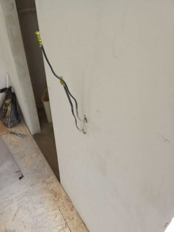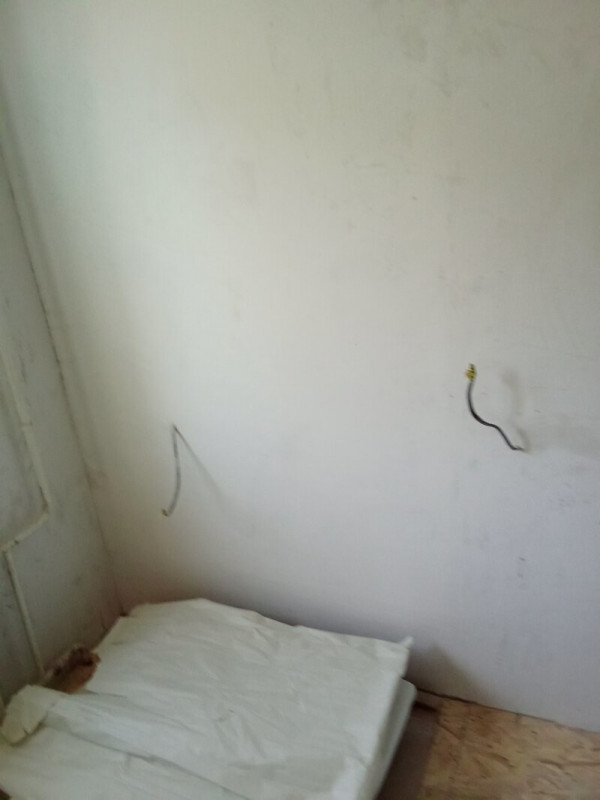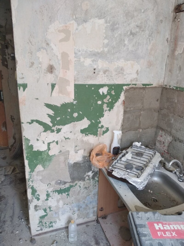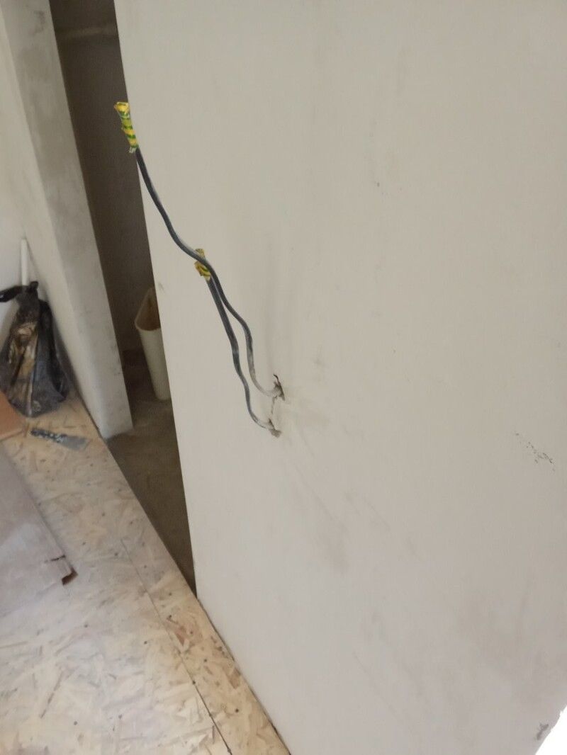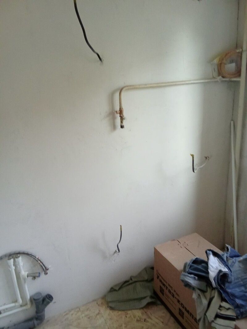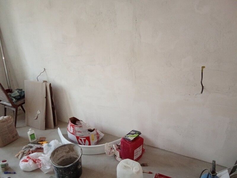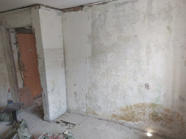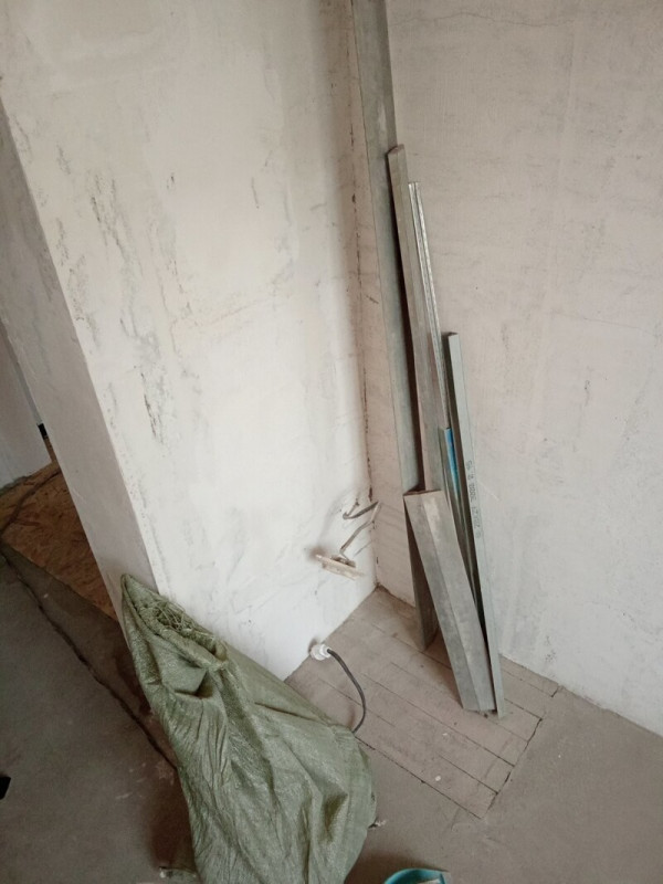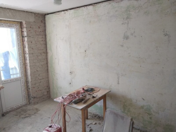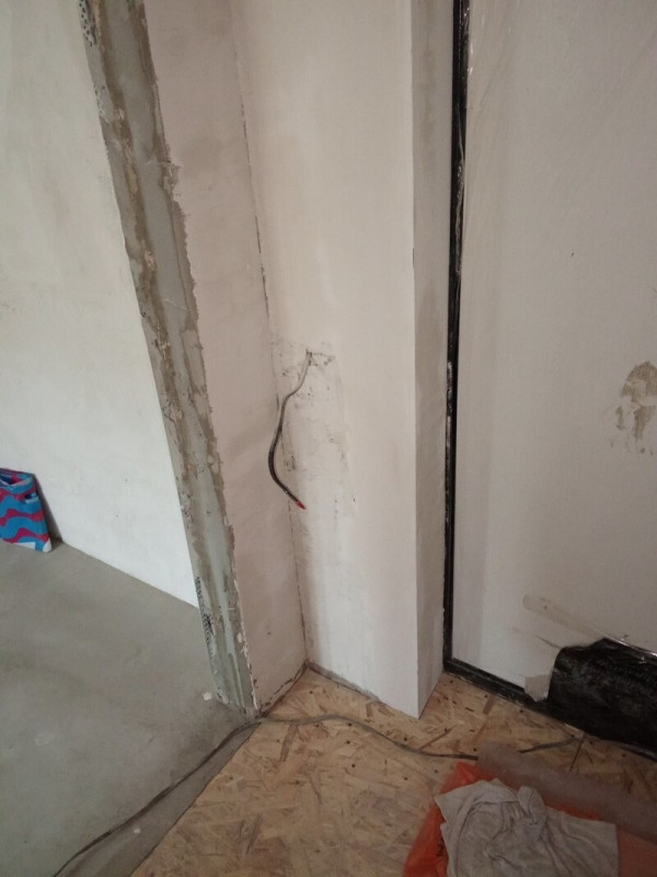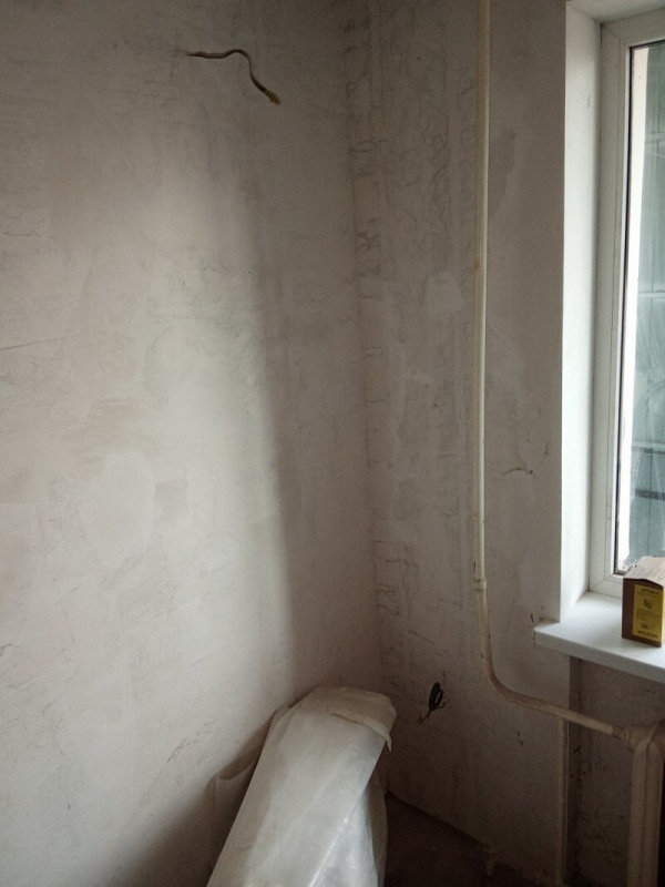 Пришлось подрывать полы в комнате и санузле, так как перепад был 2 см на 1 метр. Заливал специальной смесью. Потом выравнивал. Оштукатурил стены, зашпатлевал, сделал откосы. Электрик поменял всю проводку.