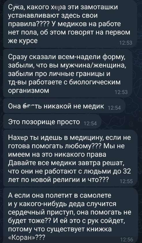 Сгибнев сообщил, что администратора с таким голосом в их клинике нет, и вся эта история - происки блогеров ради хайпа.Тепсаева не принимает мужчин не по религиозным причинам, а из-за отсутствия необходимых лицензий. Она не может проводить многие процедуры, которые требуются для диагностики мужских заболеваний. Кроме того, у нее полная запись, поэтому к ней не записаться", - пояснил Сгибнев.После главврач рассказал, что его коллега работает косметологом и трихологом, проводит дорогостоящие процедуры, которые занимают много времени. Поэтому у неё всегда много пациенток женщин. Врач может посвятить один рабочий день одному-двум пациентам, и она не хочет отвлекаться на мужчин."Через пару лет, судя по всему, к врачу вообще нельзя будет записаться, если ты не мусульманин и не уважаешь законы приезжих "специалистов"", - резюмирует "Царьград".С этой позицией согласна Марина Ахмедова:"Любые салоны красоты с хотя бы намеком на шариат надо закрывать без права возобновления. Клиника Astrey-Med тоже больше работать не должна, как бы диаспоры там ни пытались порешать. Все начинается с комнаток в салонах, а закончится тем, что закрытые тетеньки не примут пациента с аппендицитом. Он же - мужчина. А потом мальчика с аппендицитом не примут. А ты зачем шла во врачи? Ты вообще понимаешь что такое быть Врачом? Ты зачем в своем хиджабе из дома вышла? Тебе религия по всем правилам велит, накрывшись, дома сидеть. Но снова начинается старое лицемерие - половинчатое исполнение предписаний. А в половинчатым нет никакой истинной веры, только одна показуха и душевная тупость. А с душевно тупыми людьми по соседству жить не очень хочется. А ведь теперь приходится".В соцсетях же требуют проверить клинику вдоль и поперёк и наказать штрафами за отказ в приёме пациента без уважительной причины. Этак дело дойдёт до того, что эти псевдоврачи откажут больному со срочной помощью, потому что ей Коран не велит?