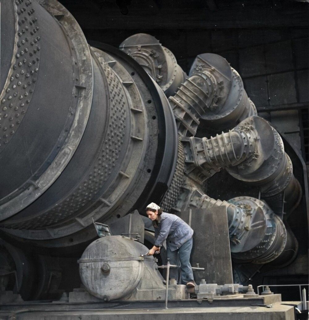 Женщина работает у печи на цементном заводе "Вулкан". Димитровград, Болгария, 1964 год.