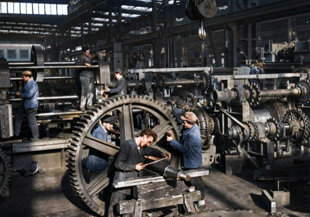 Сборочная линия станкостроительного завода (фабрики) "Иво Лола Рибар" в Железнике, недалеко от Белграда, Сербия, Югославия, середина 1960-х годов.