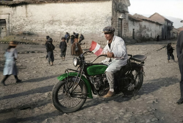 Перуанец передвигается на культовом мотоцикле фирмы "Индиан". Основанная в 1901 году, компания Indian Motocycle Manufacturing Company из Массачусетса стала пионером в мире двухколёсной техники.Её мотоциклы были не просто машинами - они становились частью легенд: гонщики на "Индианах" боролись за рекорды скорости, армия США использовала их в своих операциях, а голливудские звёзды и бизнесмены выбирали их как символ свободы и прогресса.С мощными двигателями, стильным дизайном и прочной конструкцией, "Индианы" стали синонимом качества и духа дороги.