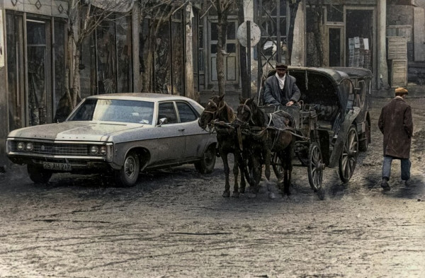 Конная повозка рядом с американским Chevrolet на улицах Эрзурума. Турция, 1973 год.