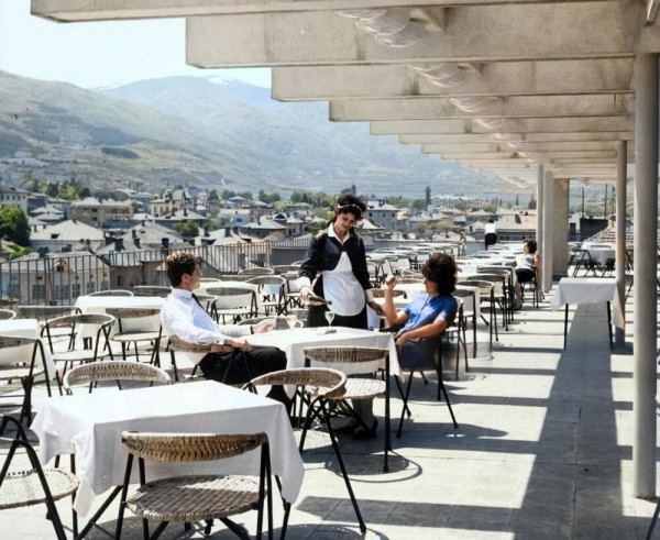 Молодая пара пьет напитки на террасе нового отеля для иностранцев недалеко от горы Осогово в Кюстендиле, Болгария, 1965 год.