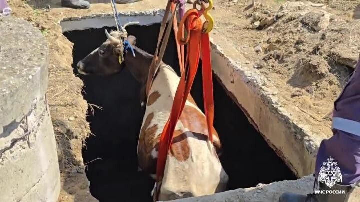 Специалисты пробили широкий проём, достали бурёнку с помощью альпинистского снаряжения и подъёмного крана, а затем отпустили на волю.