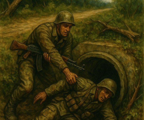 Удар. Я не понял, что произошло. Просто - боль. Как будто что-то откусили от меня сразу. Нога - в клочья. Перерубило кость. Я упал. Серёга - рядом.БУХ! - второй.На этот раз - в спину. Что-то хрустнуло, бронежилет не выдержал. Осколки застряли в ребрах, в мышцах. Тело не слушалось. Лёжа на животе, я смотрел вперёд, не моргая.- Серый?..Тишина.И вдруг - щелчок. Карабин. Его рука шарит у меня за спиной. Голос, будто откуда-то издалека:- Держись, Целый... там труба.Труба. Да. Метрах в двадцати - дренажная, бетонная, сантиметров восемьдесят высотой.Он потащил меня. Я почти не помогал ему только пытался дышать. Нога горела. В голове плыли какие-то голоса. Детский смех, телевизор. Бред.Добрались до трубы. Турникет на ногу - мне. Потом - ему. У Серёги всё бедро было в крови. Перебинтовал как смог. Втиснул меня в трубу.- Я к кустам, - сказал. - Попробую вызвать своих.Остался один.Внутри трубы - сыро, темно, пахло болотом и ржавчиной. Я заполз поглубже. Поставил автомат. Направил на выход. Молился. За него. За себя. За случайного оператора БПЛА, который вдруг может нас не заметить.Прошло минут десять. Взрывы. Где-то рядом. Потом - ещё. И ещё.Бах, бах, бах.Будто по мне, по трубе. По памяти.Я потерял сознание. Или заснул. Кто знает. Время - оно там не работает.Проснулся от того, что кто-то дёрнул автомат. Инстинктивно потянул его к себе.- Живой? - прошептали.- А мы за тобой.Трое. Пожилые. Седые. "Деды", как мы их называли. Матерясь, кряхтя, они вытащили меня, как дохлую кошку из канализации. На носилки. Один держал ствол, второй следил за небом, третий - шёл сзади, оглядываясь.- Целый? - спросил кто-то.- Пока да, - прохрипел я. На эвакуационной точке был туман. Или мне показалось. Всё плыло. Деды шептались о чём-то, один обернулся:- Мы тебя уже похоронили, слышь. Оператор "птички" увидел ноги, торчащие из завала - и всё. Доложили: "Двое - трупы."Я усмехнулся сквозь боль.- Не дождётесь.