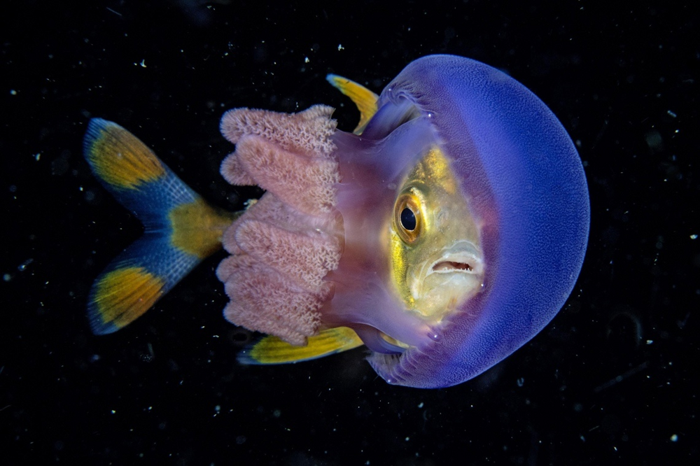 Гигантский, желтопёрый каранкс, или улуа - это морская торпеда с зубами и противным характером. Уж простите, но выглядит он как карикатурный тестостероновый качок: куча мышц, агрессии и неопределённо-невменяемый взгляд. Да и ведёт он себя также: каранксу лишь бы до кого-нибудь докопаться. Вырастают рыбины до 180 сантиметров в длину и весят под 80 килограмм - при таких габаритах докапываться можно практически до кого угодно. Плюс зубищи, плюс высокая скорость, крутая манёвренность и недюжинная сила - и вот они уже смотрят на всех остальных подводных жителей как на обед.