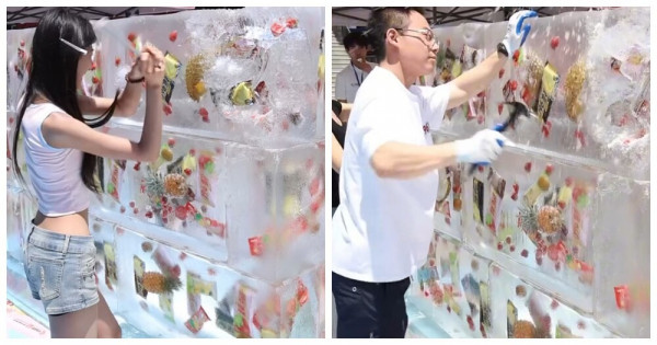 Популярное летнее развлечение в Даляне этим летом: все желающие могут попытаться вытащить из блоков льда мороженое, фрукты и ягоды.