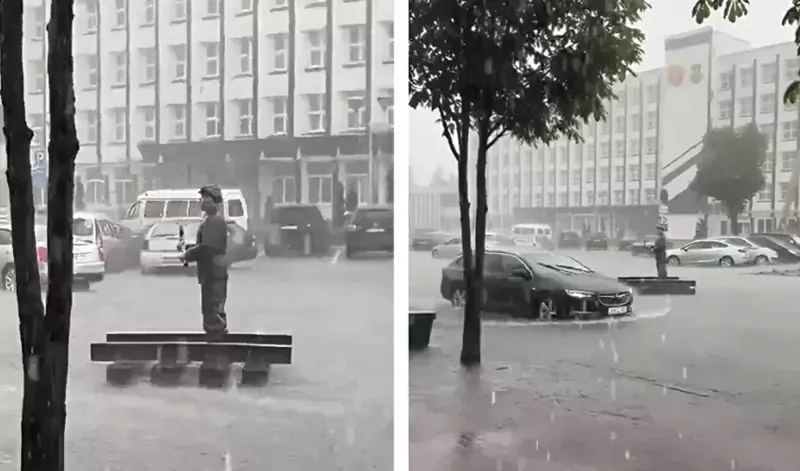 В Барановичах во время ливня произошел курьезный случай. Поток воды унес скульптуру железнодорожника, которая стояла в центре города. И пока водители и люди вокруг прятались от непогоды, фигура вальяжно плыла по течению импровизированной реки.