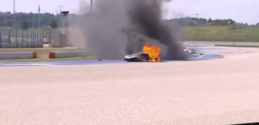 Спорткар Lamborghini задел автомобиль соперника, улетел в заграждение и моментально вспыхнул - у машины пробило топливный бак.