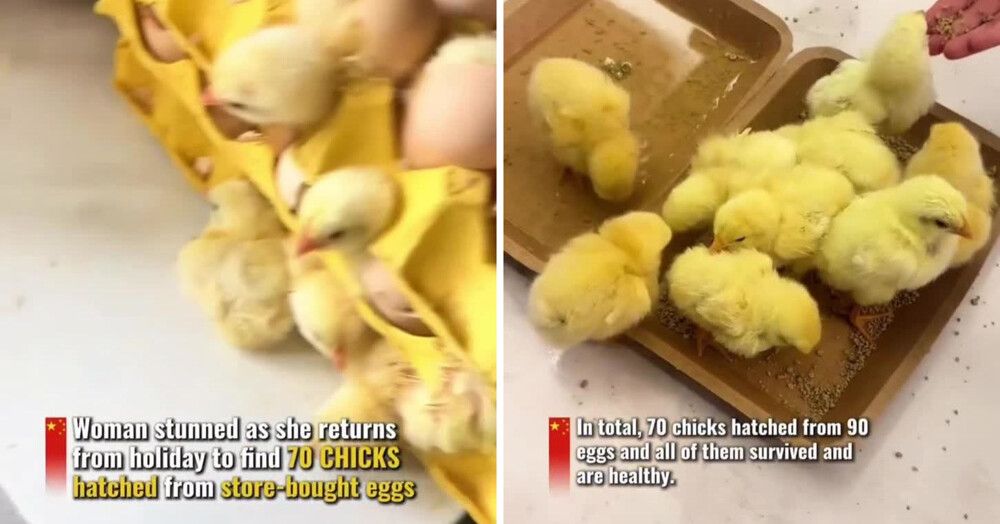 Девушка вернулась домой после двухдневного отпуска и была неожиданно удивлена: из трёх коробок с яйцами, которые она оставила дома, уже вылупилось от 40 до 50 цыплят. Всего из 90 яиц вылупилось 70 цыплят.