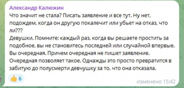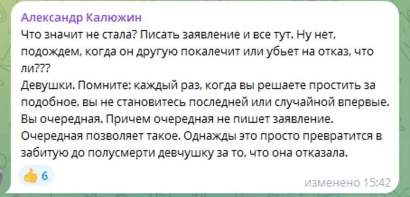 Как сообщают местные СМИ, пострадавшая не стала писать заявление в полицию, но правоохранители, мониторя соцсети, увидели ролик и заинтересовалась инцидентом. Проводится проверка. А девушкам, которые не пишут заявления о насилии, стоит задуматься, нужно ли прощать подобное.