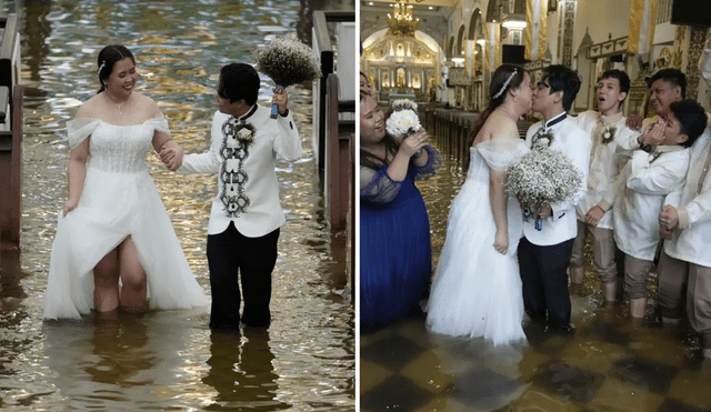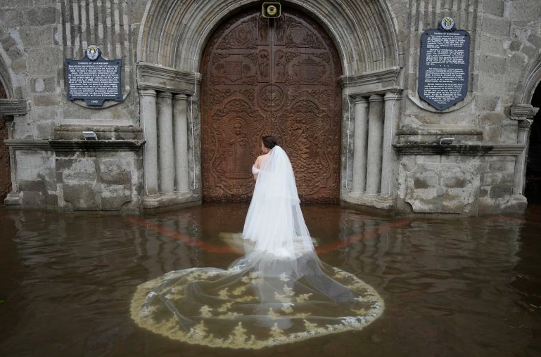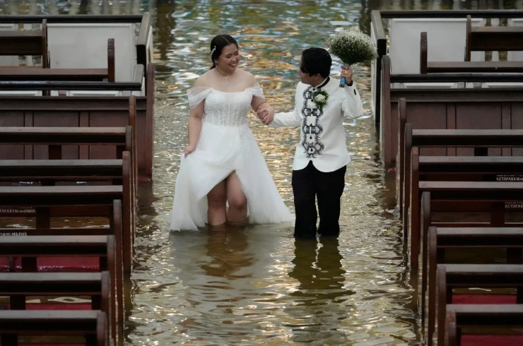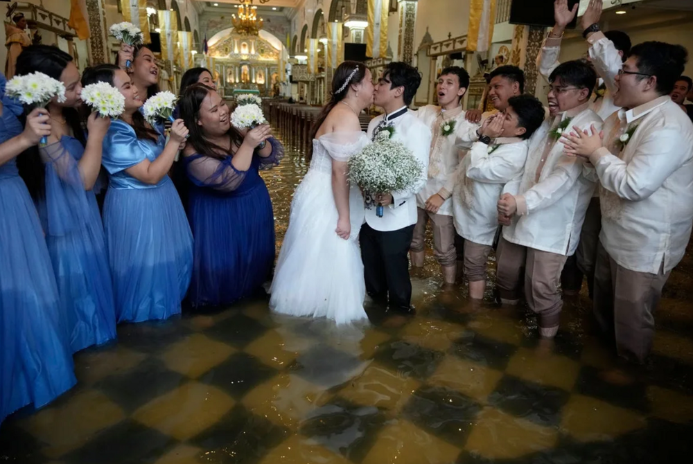 Сами филиппинцы называют это "мокрая свадьба". Церковь в Малолосе была затоплена из-за тайфуна водой по колено, но свадьбы были уже расписаны. На удивление, решили перенести бракосочетание далеко не все пары.