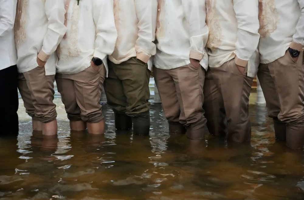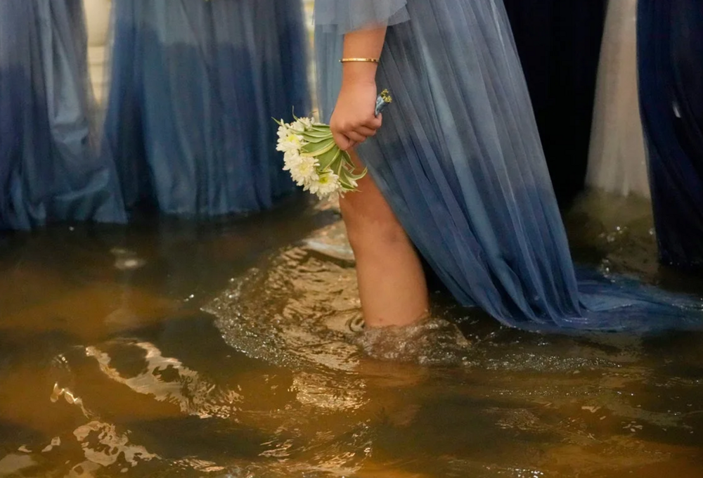 Тайфун "Вифа" в этом году усилил и без того сильные сезонные муссонные дожди на Филиппинах, вызвав масштабные наводнения. Невеста даже не стала отказываться от заранее купленного белого платья, а жених вошел в воду в традиционной рубашке баронг тагалог, которую надевают по особым случаям. К чести гостей, они тоже не отказались "окунуться". Ни подружки не отказались намокнуть, ни дети, которые несли цветы по пояс в воде.